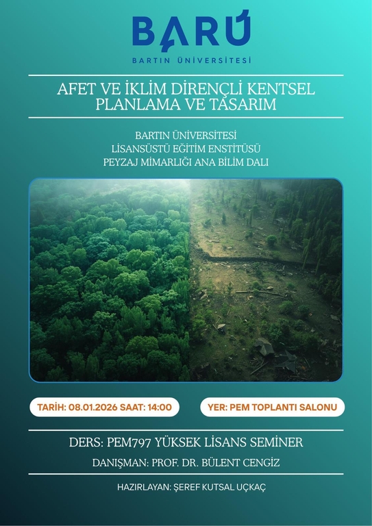 Lisansüstü Eğitim Enstitümüz Peyzaj Mimarlığı Anabilim Dalı öğrencimiz Şeref Kutsal Uçkaç, 08 Ocak 2026 tarihinde saat 14:00'de PEM Toplantı Salonunda Prof. Dr. Bülent CENGİZ danışmanlığında "Afet ve İklim Dirençli Kentsel Planlama ve Tasarım" başlıklı yüksek lisans seminerini gerçekleştirecektir.