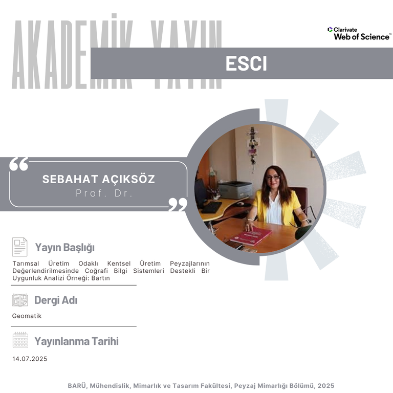 Bölümümüz öğretim üyesi Prof. Dr. Sebahat AÇIKSÖZ’ün “Tarımsal üretim odaklı kentsel üretim peyzajlarının değerlendirilmesinde Coğrafi Bilgi Sistemleri destekli bir uygunluk analizi örneği: Bartın” başlıklı çalışması Geomatik dergisinde yayımlanmıştır.