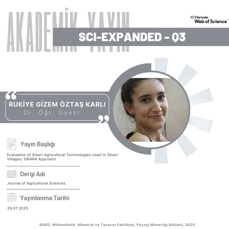 Bölümümüz öğretim üyesi Dr. Öğr. Üyesi Rukiye Gizem ÖZTAŞ KARLI’nın “Evaluation of Smart Agricultural Technologies Used in Smart Villages: SWARA Approach” başlıklı çalışması Journal of Agricultural Sciences dergisinde yayımlanmıştır.