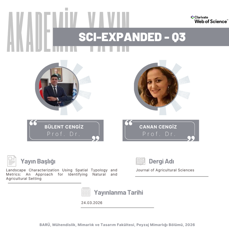 Bölümümüz öğretim üyeleri Prof. Dr. Bülent CENGİZ ve Prof. Dr. Canan CENGİZ’in “Landscape Characterization Using Spatial Typology and Metrics: An Approach for Identifying Natural and Agricultural Setting” başlıklı çalışması Journal of Agricultural Sciences dergisinde yayımlanmıştır.