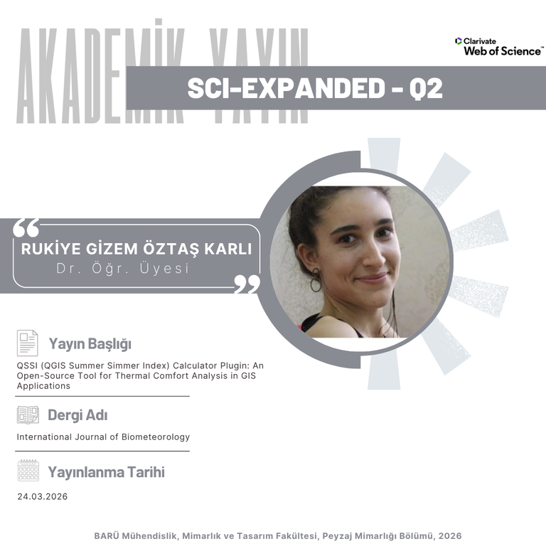 Bölümümüz öğretim üyesi Dr. Öğr. Üyesi Rukiye Gizem ÖZTAŞ KARLI’nın “QSSI (QGIS Summer Simmer Index) Calculator Plugin: An Open-Source Tool for Thermal Comfort Analysis in GIS Applications” başlıklı çalışması International Journal of Biometeorology dergisinde yayımlanmıştır.