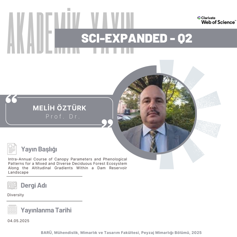 Bölümümüz öğretim üyesi Prof. Dr. Melih ÖZTÜRK’ün “Intra-Annual Course of Canopy Parameters and Phenological Patterns for a Mixed and Diverse Deciduous Forest Ecosystem Along the Altitudinal Gradients Within a Dam Reservoir Landscape” başlıklı çalışması Diversity dergisinde yayımlanmıştır. Değerli hocamızı tebrik eder, akademik çalışmalarında başarılarının devamını dileriz.