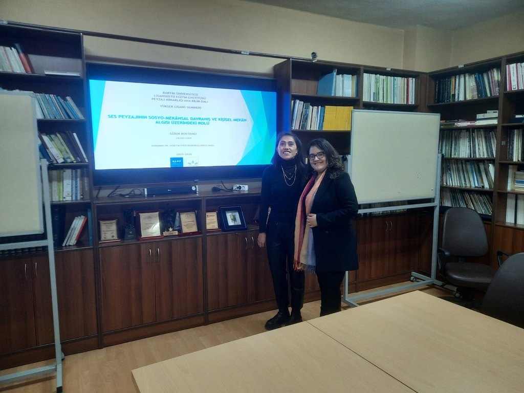 Dr. Öğr. Üyesi Pelin KEÇECİOĞLU DAĞLI danışmanlığındaki Lisansüstü Eğitim Enstitüsü Peyzaj Mimarlığı Anabilim Dalı yüksek lisans öğrencimiz Gizem BOSTANCI, 12.01.2026 tarihinde "Ses Peyzajının Sosyo-Mekansal Davranış ve Kişisel Mekan Algısı Üzerindeki Rolü" başlıklı yüksek lisans seminerini gerçekleştirmiştir.